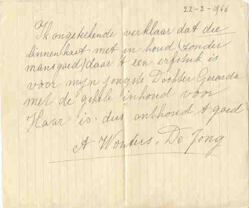 • In 1946 schrijft Anna op een papier dat haar jongste dochter erfgenaam is van een linnenkast met inhoud (zonder manskleren) daar dit een erfstuk is. • Zij is begraven op 17 april 1950 begraven op de katholieke begraafplaats Crooswijk te Rotterdam. Anna trouwde Walterus Adrianus Wouters, zoon van Johannes Felix Wouters en Margaretha Ariesd IJzelendoorn, op 9 April 1913 in Rotterdam 6.,7 (Walterus Adrianus Wouters werd geboren op 30 Oktober 1877 in Moordrecht en overleed op 27 Juli 1959 in Rotterdam.) |